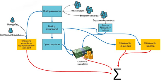 Экономика разработки интернет-проекта. Как посчитать стоимость?С какими проблемами сталкиваются руководители при разработке интернет-проектов? На что следует обратить внимание при выборе программистов, и какие задачи перед ними следует ставить? На рисунке представлена схема стоимости разработки с точки зрения Олега Бунина. Основная проблема, которую стоит решить на начальном этапе - это определиться с тем кто будет выполнять разработку проекта, например, Фрилансеры (дешёвая рабочая сила), Внешняя команда (2/3 себестоимости разработки проекта) и Внутренняя команда (средняя стоимость).