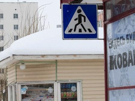 Фото 3. Знак «Пешеходный переход», судя по всему, ГИБДД решило превратить в объект социальной наружной рекламы, т.к. висит знак на фасаде здания в 2 метрах от проезжей части (кстати, на том же здании, где офис «Лампы»)… Видимо предполагается, что водитель должен чутьём догадаться что где-то должен быть знак…