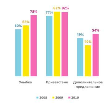 По данным исследований ГК NEXTEP, сервис в России стал более доброжелательным! С 2008 г. показатель по улыбкам плавно повышался (в 2008 – 60%, в 2010 – 78%). Сотрудники продолжают приветствовать клиентов в 82% случаев, а традиционно низкая частотадополнительного предложения выросла за год на 14% и составила 54%.