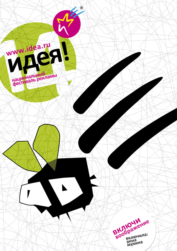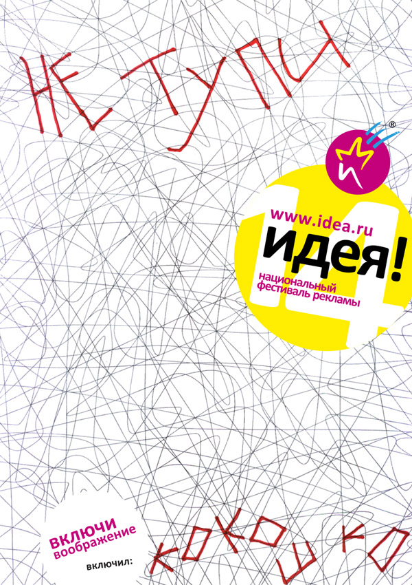 Затем мы обратились к самым креативным и крутым представителям рекламной индустрии России и Украины с просьбой помочь нам и поучаствовать в этом проекте. Все приглашённые с радостью откликнулись на наше предложение и вдумчиво почеркались в сетке. В итоге мы получили больше десятка замечательных работ, которые в дальнейшем и стали основными имиджевыми носителями фирменного стиля фестиваля «Идея!2010».